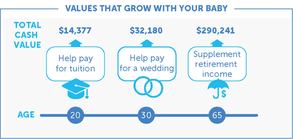 The longer your child’s policy is active, the more time the investment portion of the policy has to grow. Imagine: That 5-month old baby girl would have access to money in her policy that could be worth $14,377 by the time she is 20, $32,180 by the time she’s 30, and $290,241* by the time she is 65. These earnings could help with post-secondary tuition, a wedding, or retirement living respectively.