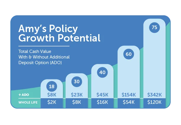 With a 20-pay whole life policy, Sara doesn’t have to worry that Finn will have to take on the cost one day, and she plans to be around to pay off the entire thing. She has made clear that she wants the best investment possible for her one and only grandchild. That’s why her advisor showed her just how much more growth was possible if she chose to go with “max ADO,” which is about $30 over budget.